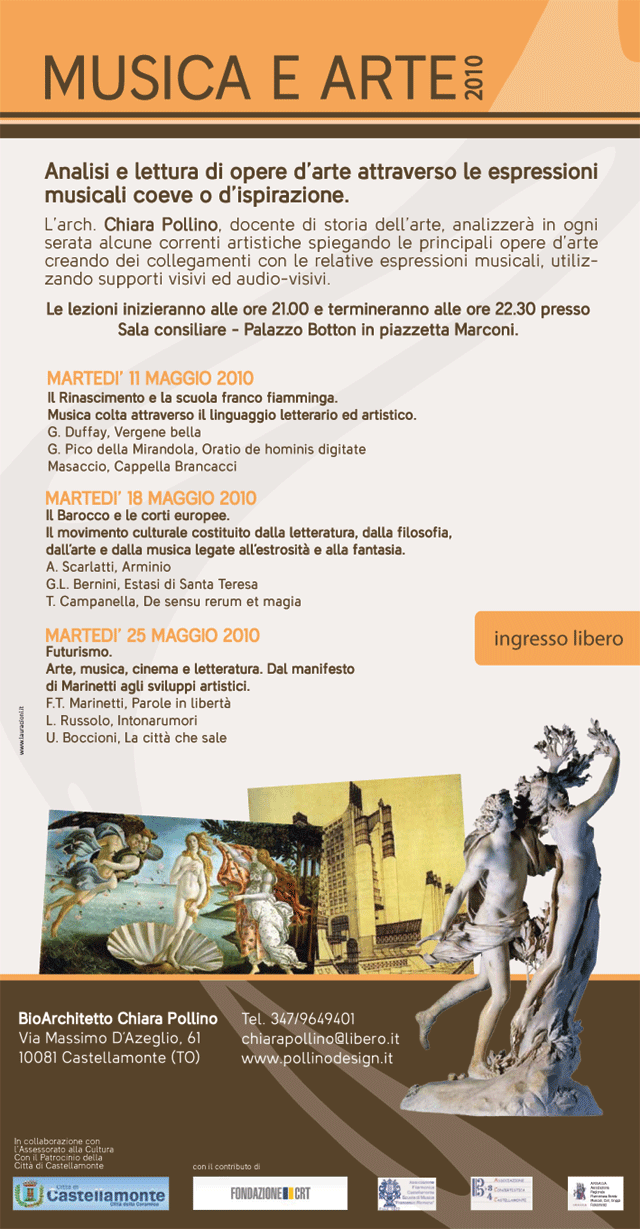 Martedì 11 maggio l'Associazione Concertistica e l'Associazione Filarmonica di Castellamonte, in collaborazione con l'Assessorato alla Cultura, con il patrocinio dell'ARBAGA e del Comune di Castellamonte, con il contributo della Fondazione CRT, hanno organizzato la prima lezione del ciclo Musica e Arte 2010 all'interno della prestigiosa ex sala consiliare di Palazzo Botton. Nel corso della serata l'arch. Chiara Pollino, docente di storia dell'arte, ha analizzato il Rinascimento e la scuola franco fiamminga evidenziando, con supporti multimediali, numerosi collegamenti che legano la musica con l'architettura, la pittura, la letteratura, la scultura ed il cinema. Il pubblico ha seguito con estrema attenzione le spiegazioni e le letture, applaudendo la preparazione multidisciplinare dell'insegnante. La seconda lezione si svolgerà martedì 18 maggio alle ore 21,00 e avrà come tema "Il Barocco e le corti europee. Il movimento culturale costituito dalla letteratura, dalla filosofia, dall'arte e dalla musica legate all'estrosità e alla fantasia", tra le altre opere verranno analizzate l'Estasi di Santa Teresa del Bernini, Arminio di Scarlatti, il De sensu rerum et magia di Tommaso Campanella.