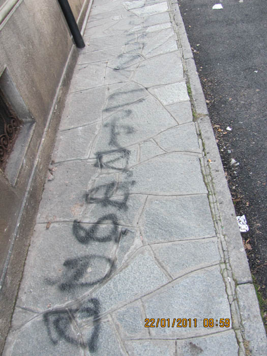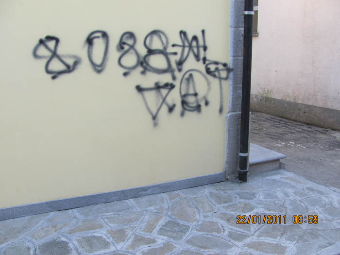 Venerdì 21 gennaio, a meno di 4 mesi dalla grandiosa cerimonia di inaugurazione della nuova Sala Musica Michele Romana, tra le 21.00 e le 23.00, proprio mentre i ragazzi della Filarmonica erano tutti all'interno della sala per le prove settimanali, qualche burlone...... (credendosi estremamente spiritoso...) ha pensato bene di mettere nero su bianco tutto il suo rancore nei confronti di una certa Susan che probabilmente lo ha lasciato (magari avendo capito quanto sale aveva in zucca....). Ecco che il maestro, contento per il buon andamento delle prove, cambia repentinamente di umore scoprendo il "regalo" verniciato in nero sia sul muro che sul pavimento. Ovviamente è stata sporta denuncia contro ignoti e si stanno visionando le registrazioni delle telecamere di sicurezza. Ragionando a sangue freddo il sentimento non è tanto quello della rabbia.... quanto quello della soddisfazione ... sì, quello della soddisfazione per i molti giovani che regolarmente frequentano la Casa della Musica, i tanti corsi di musica e di danza .... soddisfazione perchè questi ragazzi non hanno certo bisogno di essere dei vandali per divertirsi.....