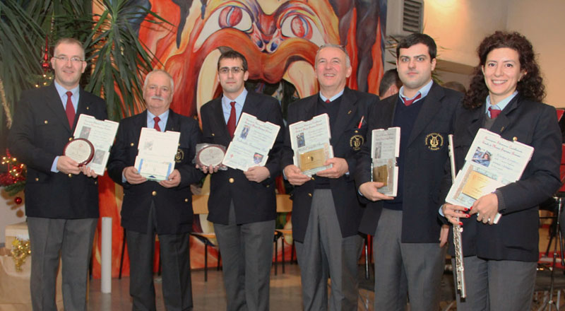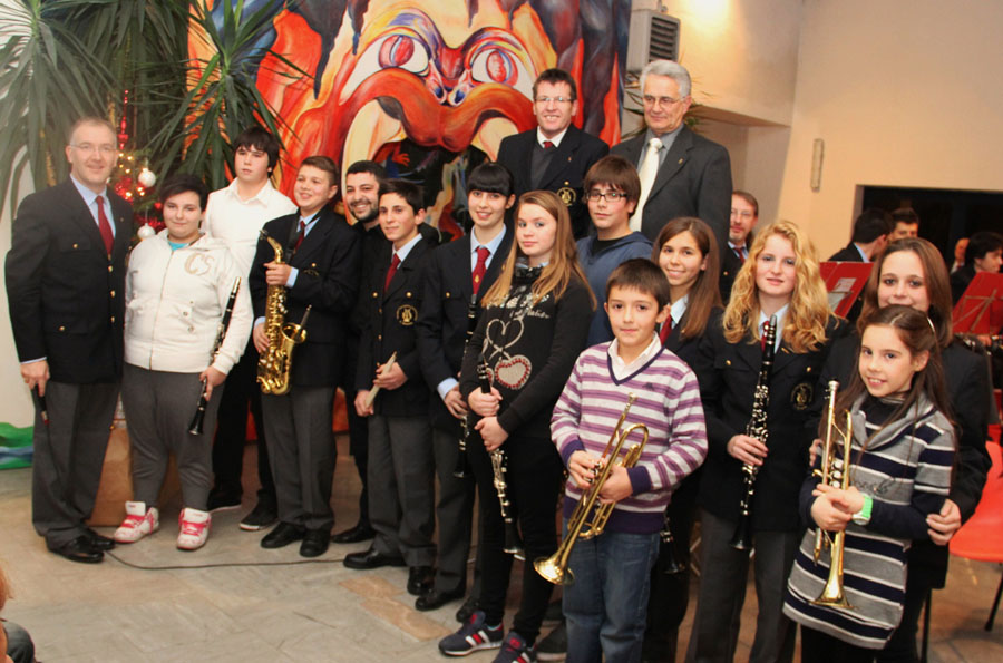 Nell'intervallo sono saliti sul palco dodici allievi del corso di musica bandistica e hanno voluto formulare i loro auguri di buone feste eseguendo di fronte a tanti familiari e amici alcune delle più tipiche melodie natalizie. Anche i tre allievi del corso di percussioni hanno preparato una loro esibizione insieme all'insegnante Fabio Berta. Sono quindi stati premiati i musici che hanno raggiunto significativi traguardi all'interno della associazione: Gabriele Giacoma Pin e Giacomo Spiller per i 10 anni di militanza, Secondino Clerico per i 15 anni, Michelangelo Ricca, Giovanni Blessent ed Angela Casile per i 20 anni. L'assessore alla cultura Falletti ed il vice sindaco Maddio hanno portato il saluto dell'Amministrazione ed infine il presidente Giacomo Spiller ha sottolineato i momenti più belli del 2012 che ha rappresentato per l'associazione il 190° di fondazione regalando ad ognuno dei 50 musici una bella fotografia ricordo. La serata si è chiusa con gli auguri scambiati insieme a qualche meritata fetta di panettone e bicchiere di spumante.