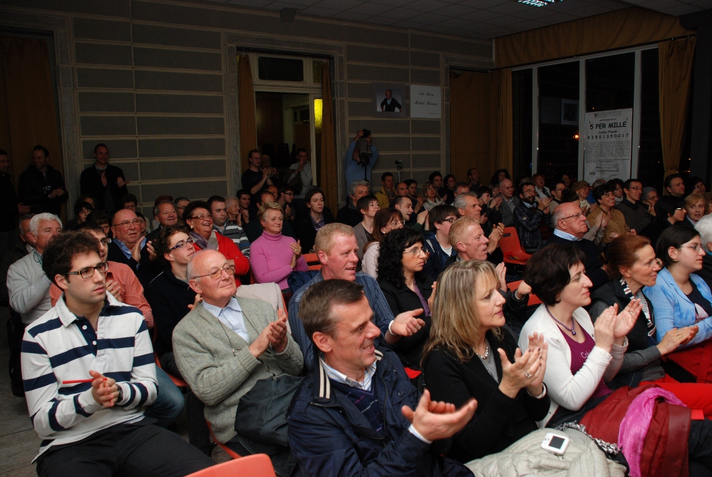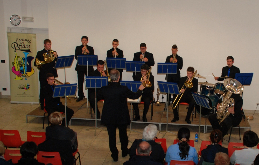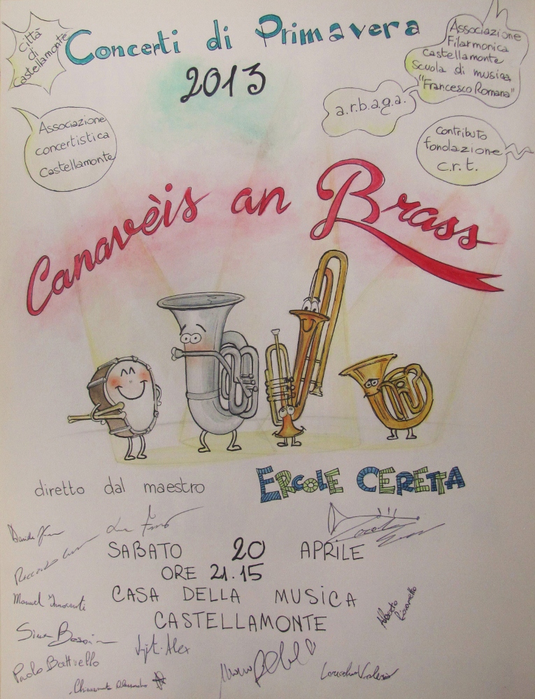 All'interno della Sala Musica "Michele Romana" si è svolto il secondo concerto di Primavera che ha visto come protagonisti i ragazzi del gruppo "Canaveis an brass", formazione ideata e diretta da Ercole Ceretta, tromba dell'Orchestra Sinfonica della Rai, e già protagonista a Castellamonte del raduno "+ fiato alle trombe". Il pubblico, accorso da tutto il Canavese, ha seguito con estrema attenzione la prima parte del concerto durante la quale sono stati proposti brani della tradizione classica, anche per ricordare il secondo centenario verdiano e wagneriano. Nell'intervallo il presidente Spiller ha sottolineato come i Conceri di Primavera siano importanti per dare a questi giovani talenti canavesani la possibilità di far conoscere i risultati di tanto studio e impegno nel mondo della musica. E' intervenuto anche l'assessore Nella Faletti a complimentarsi con il direttivo delle associazioni Concertistica e Filarmonica perchè in un periodo di così profonda crisi economica la cultura è di solito la prima a portarne le conseguenze, invece a Castellamonte queste associazioni continuano a proporre eventi di alto livello. Nella seconda parte del concerto è cambiato il repertorio e i ritmi più accattivanti, con alcuni bravi composti appositamente per questo gruppo dalla signora ... presente in sala, hanno accompagnato il pubblico in un crescendo di emozioni per giungere al finale dove il direttore è riuscito a coinvolgere il pubblico, tanto che per un attivo c'è stata l'impressione di non trovarsi a Castellamonte, bensì nel ben più famoso teatro viennese.... Nulla da eccepire sull'esecuzione, curata l'intonazione, ben gestita la dinamica e ottima la scelta dei brani che hanno dato la possibilità ai solisti di emergere e all'insieme di riempire armoniosamente di suono la sala musica la cui acustica è stata da tutti ben apprezzata. In chiusura di serata Spiller ha spiegato il perchè di alcuni articoli un pò polemici apparsi sui giornali, ne ha constatato il positivo effetto, e si è auspicato che anche per il prossimo concerto di fisarmoniche dirette da Gianni Ceretto Castigliano, presente in sala, i concittadini vincano la tentazione di addormentarsi sul divano di fronte alla televisione e accorrano ad assistere al concerto. La serata si è chiusa in allegria intorno ad un tavolo con la cena preparata dai giovani della Filarmonica di Castellamonte per i giovani dei Canaveis an brass, consolidando amicizie che durano da lunga data. La rassegna dei Concerti di Primavera è organizzata dall'Associazione Concertistica Castellamonte, in collaborazione con l'Associazione Filarmonica Castellamonte, con il patrocinio del Comune di Castellamonte - assessorato alla cultura, dell'Arbaga piemontese e grazie al prezioso contributo della Fondazione CRT.
