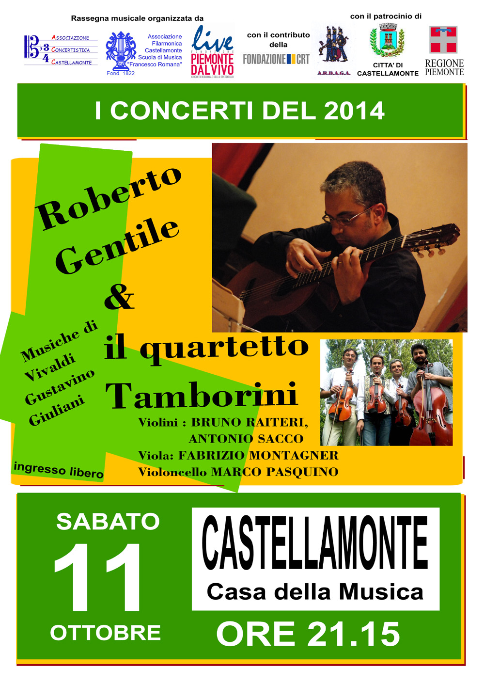 Sabato 11 ottobre 2014 alle ore 21.15 nella prestigiosa Sala dei Concerti della Casa della Musica di Castellamonte, in Piazza della Repubblica 35, si esibità il prof. Roberto Gentile alla chitarra insieme al quartetto d'archi Tamborini. Ingresso Libero.