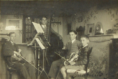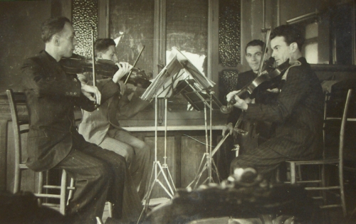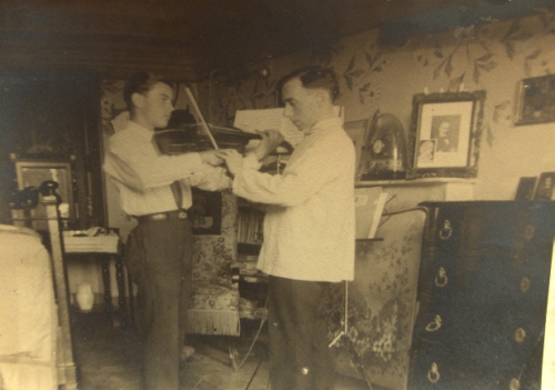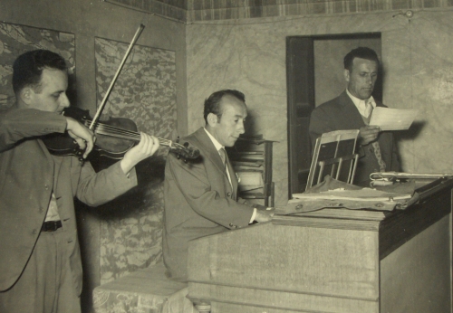 Il direttivo è estremamente soddisfatto dell'avvio di questo corso di violino perchè sfogliando le pagine del libro "Correva l'anno 1822..." si possono incontrare tante fotografie in bianco e nero di quando, nel lontano 1925, era stata attivata una scuola d'archi per mano del maestro Mandelli. Oltre a lui, maestri di fama internazionale si erano alternati per l’insegnamento musicale: ricordiamo i maestri Eugenio Ballerini, Italo Ballora e Aristide Colombo per violino e viola, Benedetto Mazzacurati e Angelo Cuneo per violoncello e contrabbasso. A fine corso gli allievi venivano esaminati da una commissione giudicatrice e fra i nomi illustri deve essere citato il grande maestro Franco Alfano: per testimoniare il suo passaggio nella Società Filarmonica venne incisa e murata una targa in marmo nero tutt’ora presente nel salone dei concerti. I più anziani forse ricorderanno ancora le prestigiose esibizioni del quartetto d’archi denominato "Quartetto Mandelli" composto da allora giovani castellamontesi fra cui Giuseppe Maria Musso e Ontario Cattarello, violino, Piero Sferati, viola, Elio Sferati, violoncello e contrabbasso. Facendo un salto di 30 anni si arriva poi agli anni del maestro di violino Renzo Chiantaretto che fino a pochi anni fa ha seguito con passione le vicende della filarmonica donando alla stessa il suo prezioso strumento e tutta la sua collezione di manoscritti ed edizioni musicali, gelosamente oggi custoditi nella biblioteca storica musicale dell'associazione. Pubblichiamo qui di seguito una fotografia in cui è ritratto al violino ad accompagnare il maestro Mario Nubola al pianoforte ed il canto di Tino Fassio.